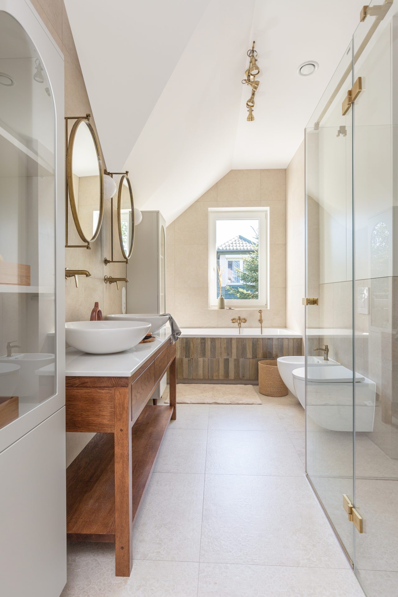 Klienci zmierzyli się z wyzwaniem trudnego układu łazienki – pomieszczenie było przestronne i pięknie doświetlone, ale trudno było zmieścić wszystkie elementy, na których im zależało. Zaproponowałam rozwiązania, które maksymalizują przestrzeń i nadają łazience unikalny charakter: stelaż slim do WC wiszącego ukryty w sąsiednim pomieszczeniu, wolnostojącą wannę ustawioną pod kątem na tle okien oraz kamienne umywalki o nietypowym kształcie. Efekt? Połączenie funkcjonalności z estetyką.
